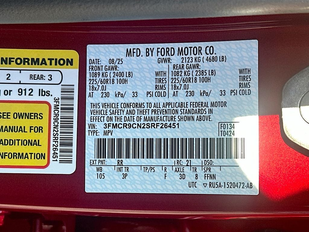 Ford Co-Pilot360 Assist 2.0: Reverse Brake Assist; Front Parking Sensors; 360-Degree Camera with Trail and Split View. Outer Banks Tech Package+: B&O Sound System by Bang & Olufsen; Connected Navigation; HD Radio. Equipment Group 300A: 18" Ebony Black Wheels; Premium Trimmed Front Bucket Seats W/ebony/roast; 8-Speed Automatic Transmission; 225/60R18 All Season Tires Bsw; AM/FM Stereo; 1.5L EcoBoost Engine. Ruby Red Met Tinted CC. **Equipment listed is based on original vehicle build and subject to change. Please confirm the accuracy of the included equipment by calling the dealer prior to purchase.**
