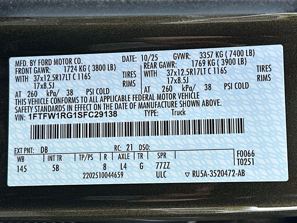 Equipment Group 802A Raptor 37: Electronic Locking with 4.10 Axle Ratio; Dual Valve Shocks; Raptor 37 Unique 17" Forged Cast Wheels; Carbon Fiber Interior Appliques; RECARO Alcantara Suede Front Seats; Modular Front Bumper; 3.5L V6 EcoBoost High Output Engine; Electronic 10-Speed Automatic Transmission; 37x12.5R17 BSW All-Terrain Tires; 7. 400 lbs GVWR; B&O Unleashed Sound System by Bang & Olufsen Radio. Twin Panel Moonroof. Tough Bed Spray-In Bedliner. Shelter Green. **Equipment listed is based on original vehicle build and subject to change. Please confirm the accuracy of the included equipment by calling the dealer prior to purchase.**