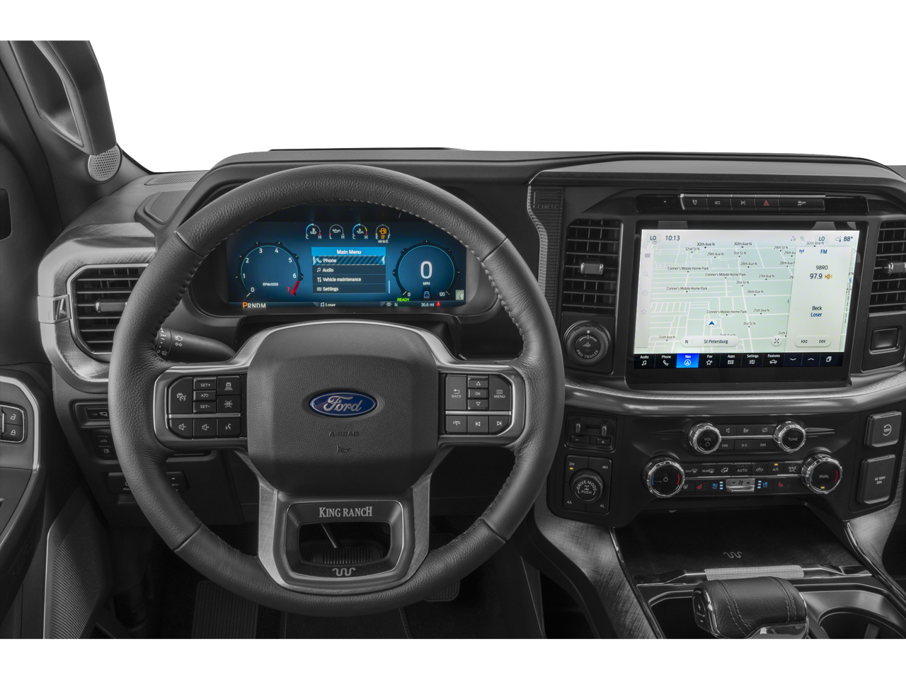 FX4 Off-Road Package: Off-Road Tuned Front Shock Absorbers; Skid Plates; Monotube Rear Shocks; 4x4 FX4 Off-Road Bodyside Decal; Hill Descent Control; Tray Style Floor Liner with Carpet Mats. Equipment Group 601A High: 275/60R20 BSW A/T Tires; King Ranch Multicontour Leather Bucket Seats; 20" Chrome-Like PVD Wheels; Power-Deployable Running Boards; B&O Unleashed Sound System by Bang & Olufsen Radio. Twin Panel Moonroof. Star White Metallic TC. Pro Power Onboard - 7.2KW. Head-Up Display. Driver's Side SecuriCode Keyless-Entry Keypad. Tray Style Floor Liner with Carpet Mats. Skid Plates. **Equipment listed is based on original vehicle build and subject to change. Please confirm the accuracy of the included equipment by calling the dealer prior to purchase.**