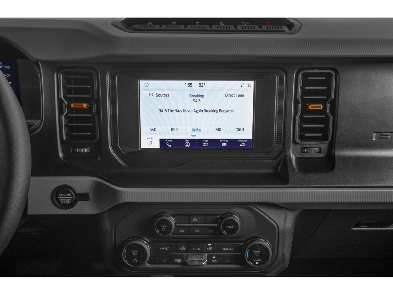Equipment Group 332A Mid Package: 17" Machined Carbonized Aluminum Wheels; Rear Parking Sensors; Power Outlet - Back Side of Center Floor Console; Front Row Heated Seats; Auto-Dimming Interior Rearview Mirror; Driver and Front Passenger Illuminated Sliding Visor Vanity Mirrors; 6. 100 lbs GVWR; AM/FM Stereo; Dual-Zone Electronic Automatic Temperature Control; Enhanced Voice Recognition; Connected Navigation; LT285/70R17 A/T Tires; Ambient Footwell Lighting; Remote Start System; Marine Grade Vinyl Bucket Seats; 2-Door Intelligent Access with Lock/unlock. Ford Co-Pilot360: Auto High-Beam Headlamps; Rear View Camera; Pre-Collision Assist with Automatic Emergency Braking; Blind Spot Information System (BLIS); Lane-Keeping System. Front and Rear Floor Liners. **Equipment listed is based on original vehicle build and subject to change. Please confirm the accuracy of the included equipment by calling the dealer prior to purchase.**