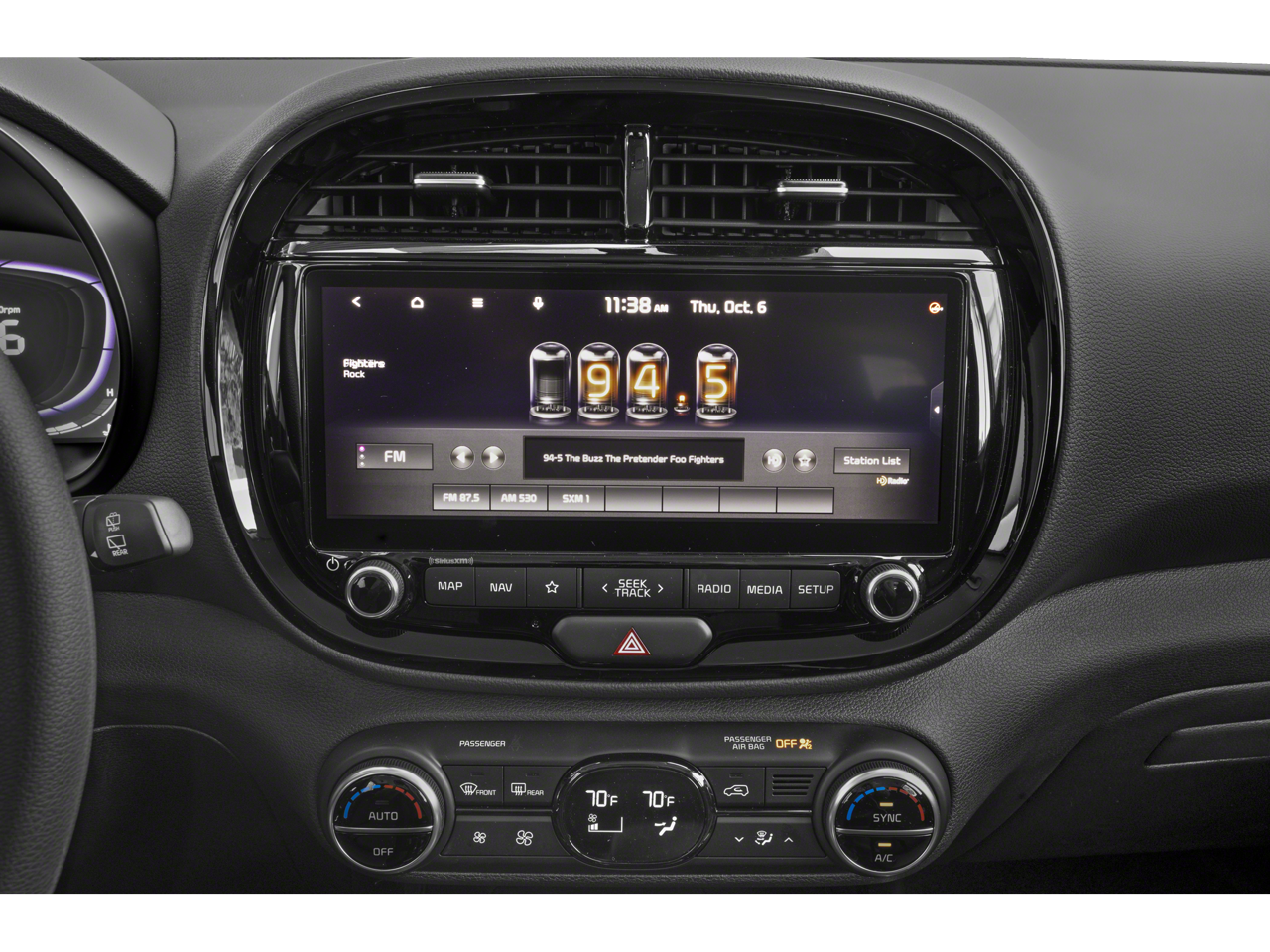 - Radio: AM/FM/MP3/HD Audio System -inc: UVO link, navigation, SiriusXM, 10.25" color touch screen, 6 speakers, support for Android Auto and Apple CarPlay, USB input, audio remote control, Bluetooth® hands-free w/voice recognition and black shark fine type antenna