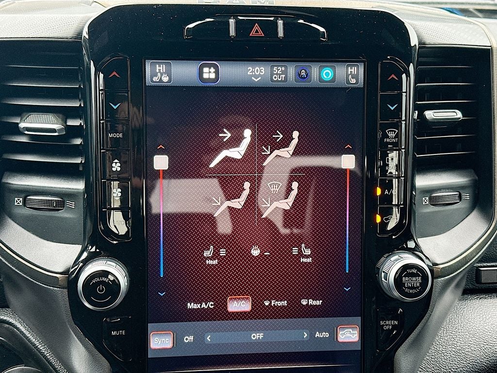 Night Edition: Black Front Bumper with Black Plate; Grille Moustache with Black Outline; Luxury Leather-Faced Front Bucket Seats; 18" X 8.0" Gloss Black Wheels; Black RAM Grille Badge. Rebel Level 1 Equipment Group: Google Android Auto; 1-Year SiriusXM Subscription; Uconnect 5WW Navigation with 12.0" Display Radio; For More Info. Call 888-539-7474; USB Mobile Projection; Rear Window Defroster; Integrated Centre Stack Radio; For Details Visit DriveUconnect.ca; Power Adjustable Pedals; Rear Power Sliding Window; Rear Dome Lamp with On/off Switch; Hands-Free Phone Communication; Connectivity - US/Canada; Emergency Vehicle Alert System (EVAS); 12" Touchscreen; GPS Navigation; 4G LTE Wi-Fi Hot Spot; GPS Antenna Input; Power 8-Way Driver Seat; SiriusXM with 360L On-Demand Content; Global Telematics Box Module; Connected Travel and Traffic Services; Front Heated Seats; Heated Steering Wheel; Door Trim Panel Foam Bottle Insert; Apple CarPlay Capable; Off-Road Info Pages; 9 Alpine Speakers with Subwoofer; Disassociated Touchscreen Display; HD Radio; Universal Garage Door Opener; 2nd Row In-Floor Storage Bins; Sun Visors with Illuminated Vanity Mirrors; Power 2-Way Driver Lumbar Adjust. Quick Order Package 27W. **Equipment listed is based on original vehicle build and subject to change. Please confirm the accuracy of the included equipment by calling the dealer prior to purchase.**
